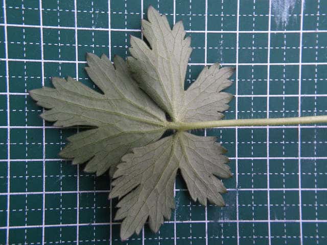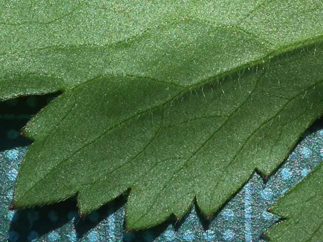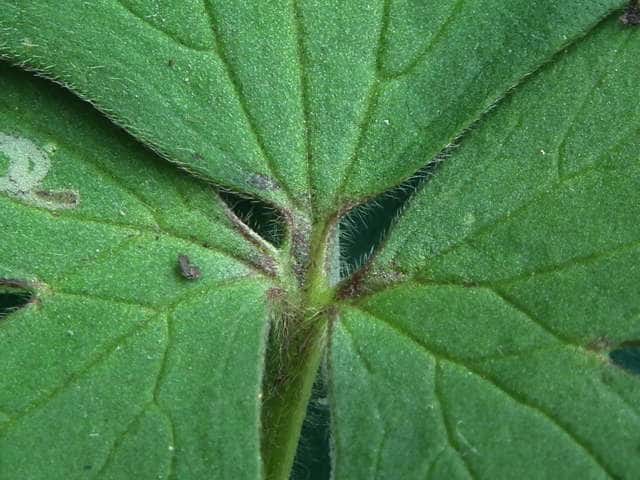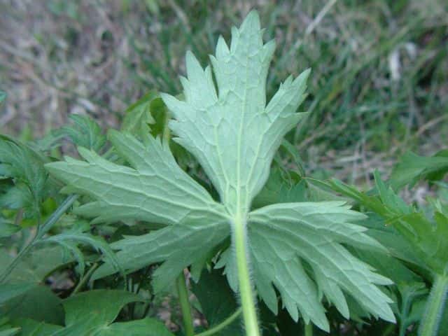 | ▼裏面に伏毛がある。 | ▼中部の葉は深裂し、葉柄がある。 | |