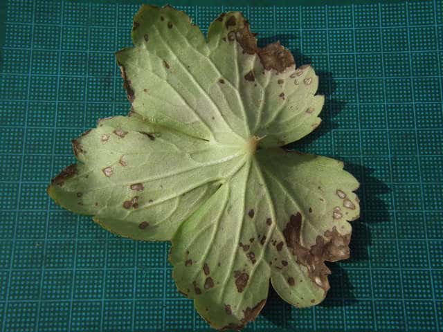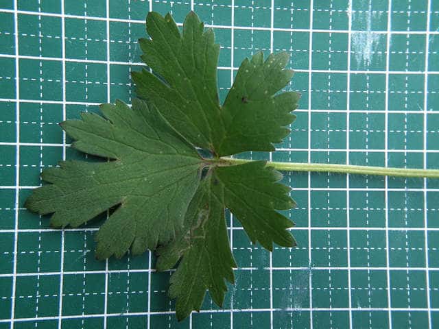 | ▼根生葉は長柄がある。 | ▼右の葉は複葉のように3深裂している。 | ▼複葉のように3深裂し、小葉に柄があるよう に見える。 |