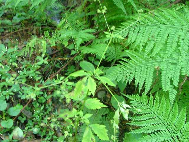 | 多年草 北海道〜本州の山地の林内に生える。茎は高さ30〜80cm。葉は3全裂し、側小葉はさらに2裂する。茎頂に小型の散形花序を出し、中央に両性花、周辺に雄花をつける。花は白色。両性花は子房にかぎ状毛が密生する。雄花は子房がないため小さく目立たない。果実はかぎ状刺毛が密生する。花期は7〜9月。(山に咲く花) 学名は、Sanicula chinensis セリ科ウマノミツバ属 葉のよく似たものにミツバがある。 |