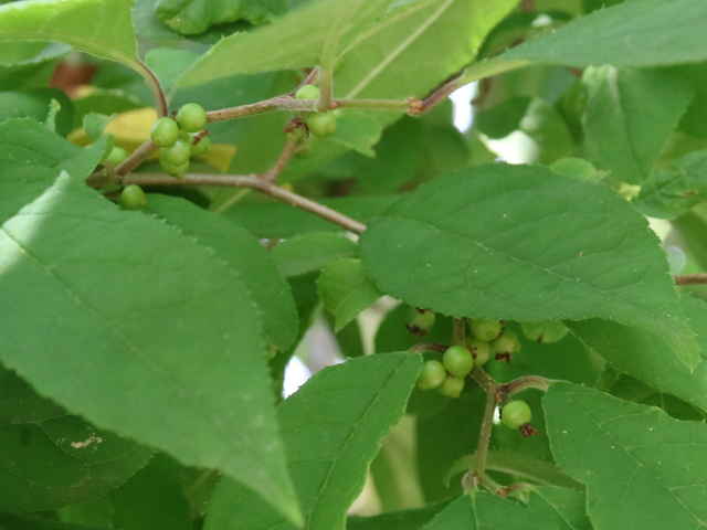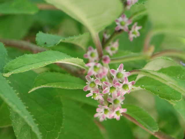 | 落葉低木 本州〜九州の湿地または湿った落葉広葉樹林内に生える。高さ2〜3mになる。枝は暗褐色。本年枝は細く、垢状の短毛がある。側枝は短枝化しやすい。葉は互生。葉身は長さ3〜8cm、幅1.5〜3cmの楕円形または卵状長楕円形。先端はとがり、基部は鋭形。ふちには細かい鋸歯がある。表面には短毛が散生し、裏面脈上には細かい開出毛がある。葉柄は長さ4〜9mm。雌雄別株。本年枝の葉腋に淡紫色の花をつける。花序の軸がきわめて短いので、花は束生しているように見える。雄花序には5〜20個、雌花序には2〜4個の花がつく。花は直径3〜4mm。花弁は4〜5個、楕円形で長さ約4mm。萼片は4〜5個。雄花には雄しべが4〜5個と退化した雌しべがある。雌花には退化した雄しべがある。子房は球形で花柱はごく短い。果実は核果。直径約5mmの球形で、9〜10月に赤色に熟し、落葉後も落ちずに残り美しい。なかには核が4〜5個入っている。核は三角状楕円形で長さ約2mm、表面はなめらか。花期は6月頃。 冬芽は円錐形で長さ1mmほど。しばしば副芽を伴う。芽鱗は4〜8個。葉痕は半円形で、左右に微小な突起(托葉)がある。維管束痕は1個。(樹に咲く花) 学名は、Ilex serrata モチノキ科モチノキ属 |