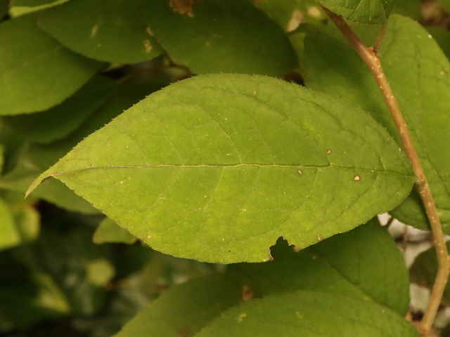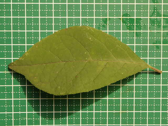| ▼葉身は約10cm、葉柄は約1cm。 | ▼表面には短毛が散生する。 | |