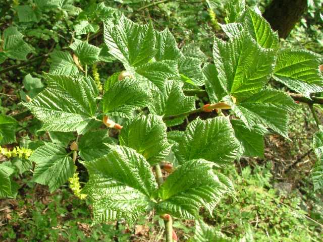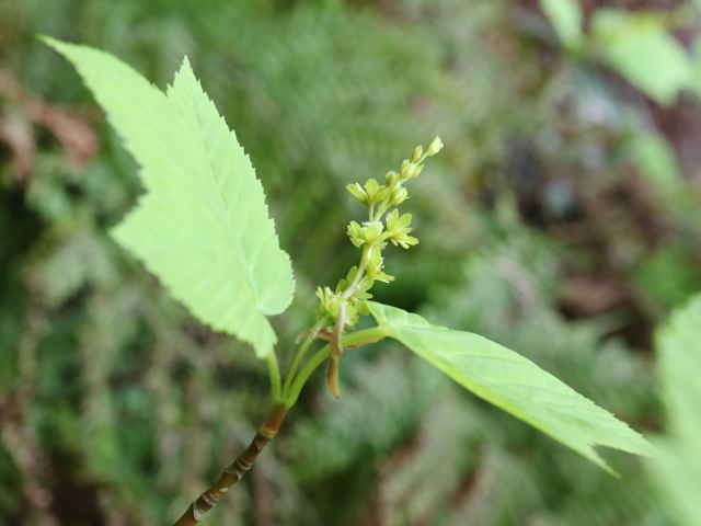| 落葉高木 本州〜九州の山地のやや湿気のある谷間や緩やかな斜面に生え、疎林内に多い。関東地方では標高300〜1500mに生育し、まれに2000m付近でも見られる。幹は直立し高さ8〜10m、直径25〜30cmになる。まれに高さ20m、直径70cmに達するものもある。若木は暗緑色に黒い縦縞が入り、菱形状の皮目が点在する。老木の樹皮は灰褐色で縦に浅く裂ける。枝は緑色で無毛。葉は対生。葉身は長さ10〜15cmの扇状五角形で浅く3〜5裂する。裂片の先は鋭くとがり、縁には重鋸歯がある。中央の裂片は広三角形で大きい。質はやや厚く、裏面の脈上と脈腋に赤褐色の毛がある。葉柄は緑色で長さ2〜6cm、花時には赤褐色の毛がある。雌雄別株。まれに同株。淡緑色〜淡黄色の花を総状花序に10〜15個つける。花序は長さ5〜10cmで褐色の軟毛がある。花は直径8〜10mm。雄花は雌花より大きい。花弁は5個。へら形。雄花の雄しべは8個。雌花の子房には赤褐色の縮毛があり、花柱はくるっとまるまる。花柄は長さ2〜5mm。果実は翼果。分果は長さ2.5〜3cmで、赤褐色の縮毛がある。翼はほぼ直角に開き、種子の部分が丸く膨らむ。7〜10月に熟す。花期は5月頃。 冬芽は、枝先に頂生側芽を伴った頂芽がつく。側芽は対生する。芽鱗は2対、紅色または紫紅色。頂芽は長さ7〜13mmの長卵形。葉痕はV字形又はU字形、維管束痕は3個。(樹に咲く花) 学名は、Acer rufinerve ムクロジ科カエデ属 |