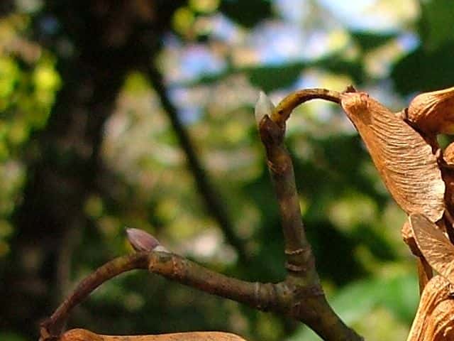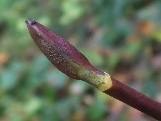 | ▼2013年2月14日 頂芽と頂生側芽 島根 | ▼側芽 冬芽には柄がある。 | ▼葉痕はU字形、維管束痕は3個。 |