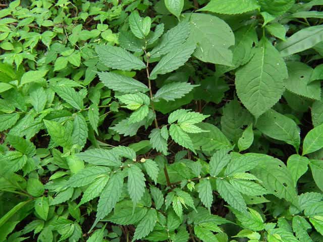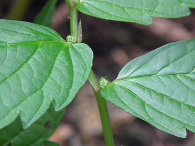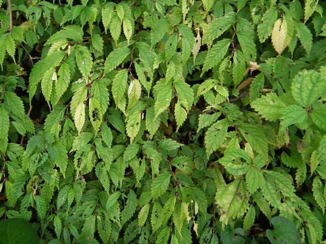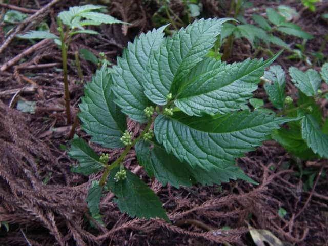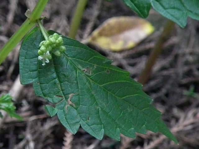 | 多年草 北海道〜九州の山地の水湿斜面にやや群生する。茎は毛がなく多汁で、長さ30〜40cm、斜めに立つか、斜面に垂れる。葉は長楕円形で左右不同、長さ5〜12cm、先は鋭くとがり、内側辺では3〜10個、外側辺では6〜13個の鋸歯があり、両面に短い毛がまばらにある。花は緑白色で、春には雄花序が出て、その脱落後に雌花序が開くが、短い茎では雌花序しかつけないことが多い。雄花序には長さ1〜2cmの柄があるが、雌花序には柄がない。雄花は4花被片と4雄しべがある。雌花被片は3個で、背面に短毛が多い。そう果は卵形で淡黄色、長さ約1mm。秋遅くになると茎の節がふくらんだむかご状になり、ばらばらに離れて落ち、発芽して新苗になる。花期は4〜9月。(日本の野生植物) 学名は、Elatostema involucratum イラクサ科ウワバミソウ属 よく似たヒメウワバミソウは鋸歯が2〜5個ある。またヤマトキホコリは雌雄同株で花は柄がなく球状。時に有柄の雄花序。花期が8〜10月。 ウワバミソウの果実の基部に数個の透明質な丸まったものがあります。アオミズの果実の基部にも同様なものがあり、果実を押し出す退化雄しべだとする記載があります。同科のウワバミソウでも同じような構造なのでしょうか。 |