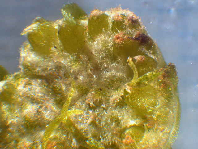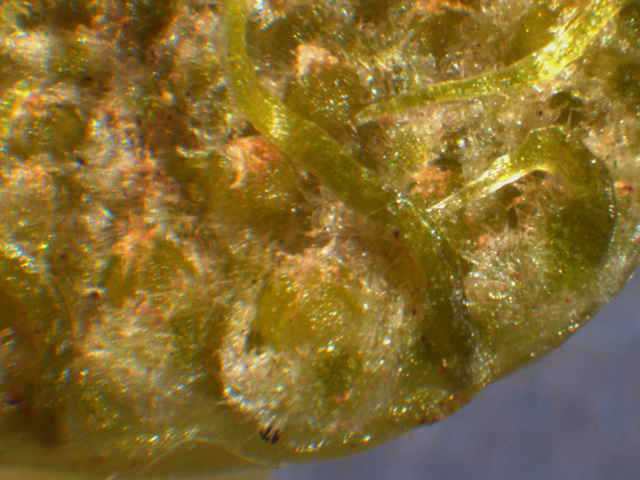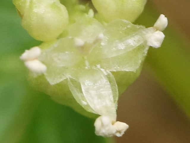 | ▼花被片は軟質で取り出せない。 | ▼果期に入った雌花。 | ▼雌花は長さ約0.5mm、幼果(下)は1mm。 |