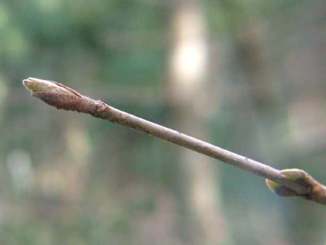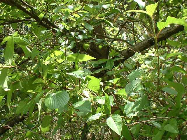 | 落葉低木 本州〜九州に生え、山野の谷沿いに生え、高さ2〜6m。枝を水平にだす。葉は対生し、長さ5〜16cmの倒卵形〜長楕円形。先端は急にとがり、基部は円形〜くさび形で、鈍鋸歯。枝先に散形花序をだして、小さな両性花をつけ、ふちを白い装飾花がとりまく。両性花の花冠は深く5裂してそりかえる。装飾花の1〜2個の裂片はごく小さい。花期は5〜6月。 冬芽は、長さ4〜9mmの長楕円状披針形。表面には星状毛が多い。2個の芽鱗が合着して冬芽を包んでいる。 学名は、Viburnum plicatum var. tomentosum ガマズミ科ガマズミ属 日本海側には、毛が少なく、葉が円形〜広卵形のヒロハヤブデマリ(ケナシヤブデマリ)が分布するので、ここに載せたものもその可能性がある。 |