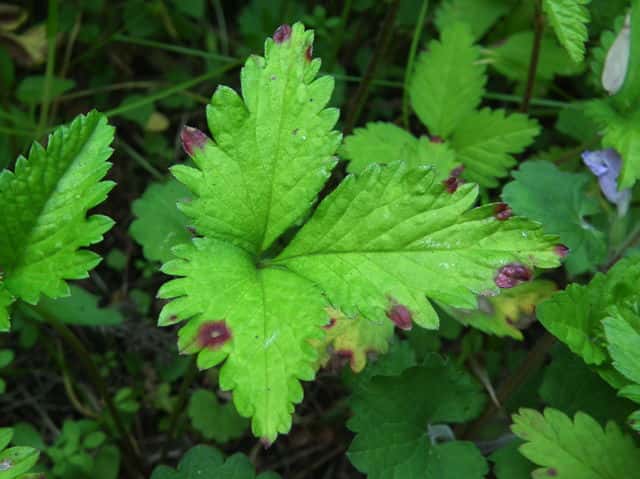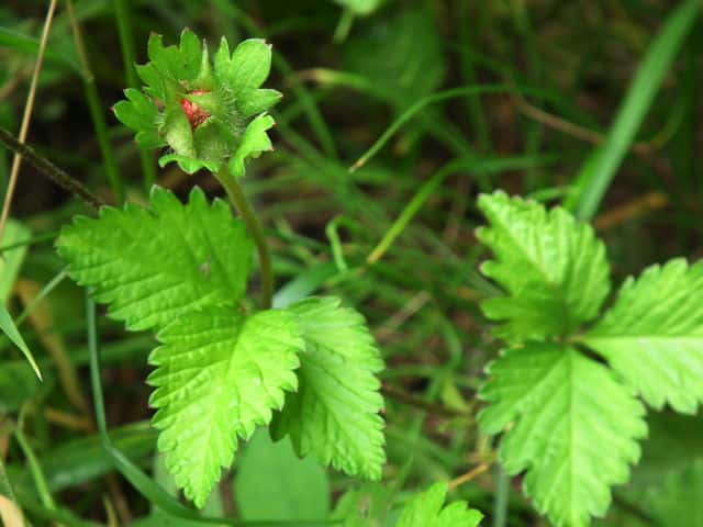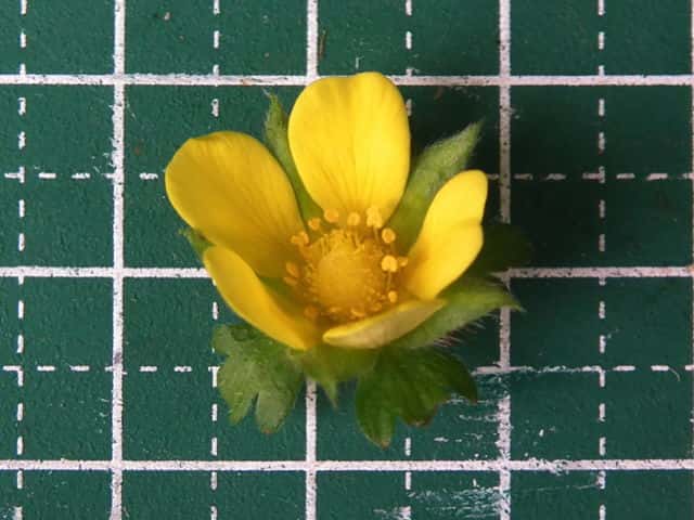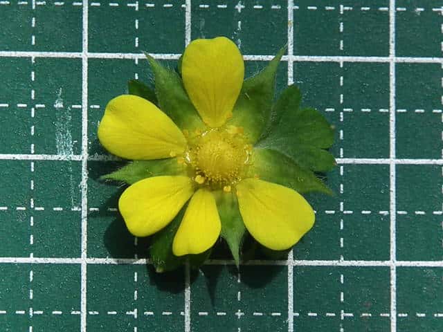 | ▼小葉は菱形状楕円形で先は尖る。 | ▼ヘビイチゴとの集合果の比較。 | |