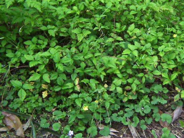 | 多年草 本州〜九州のやぶや林縁などに多い。ヘビイチゴより全体に大型で、葉は濃緑色。小葉は長さ3〜4cm。花は直径約2cm。果実は直径2〜2.5cm。果床は濃紅色で光沢がある。そう果にはしわがなく、光沢がある。花期は4〜6月。(野に咲く花) 学名は、Potentilla indica バラ科キジムシロ属 ヘビイチゴのそう果には光沢がない。また、花は直径1.2〜1.5cm(〜2cm)で、小葉の先が円い。果期には花はない。ヘビイチゴとの比較。 |