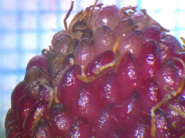 | ▼若い果実は長さ約8mm、果床はまだ白い。 | ||