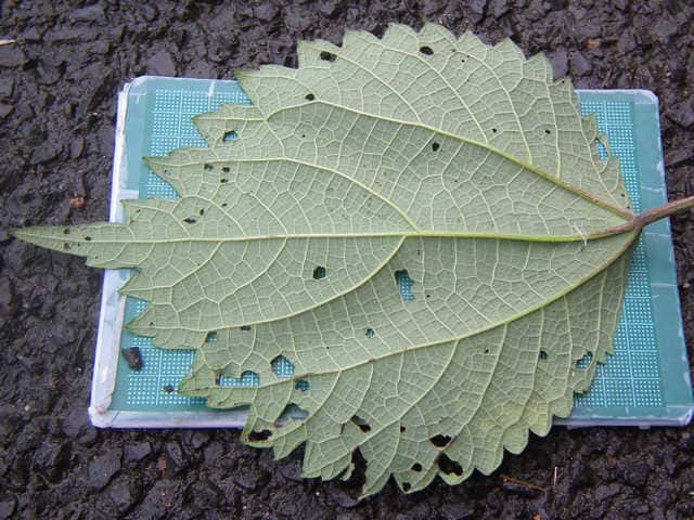| ▼葉は長さ約14cm、幅約16cm。片側14個の鋸歯。小さな重鋸歯がある。 | ||