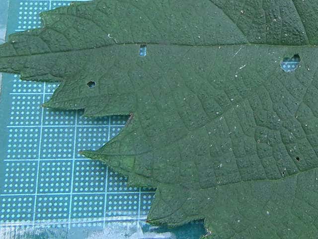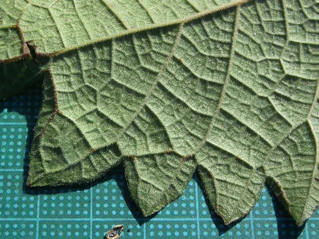 | ▼雌花 | ▼葉は長さ約23cm、幅約24cm。片側18個の尖った鋸歯が並ぶ。 | |