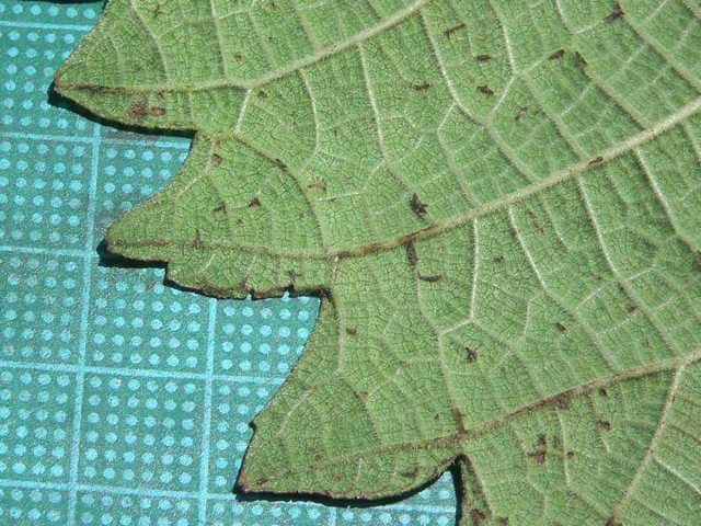 | ▼葉は長さ約16cm、幅約20cm。 | ▼鋸歯は大きく、重鋸歯がある。 | |