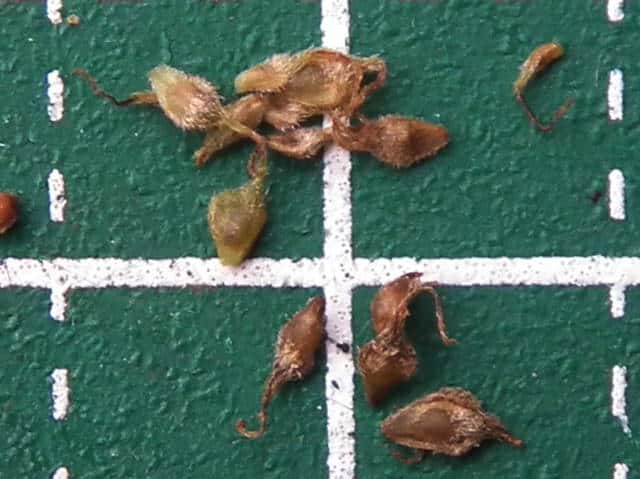 | ▼果実は翼のある花被筒に包まれている。 | ▼花被筒の上部には長毛がある。 | ▼花被筒を除いた果実、長さ約2.5mm。 |
