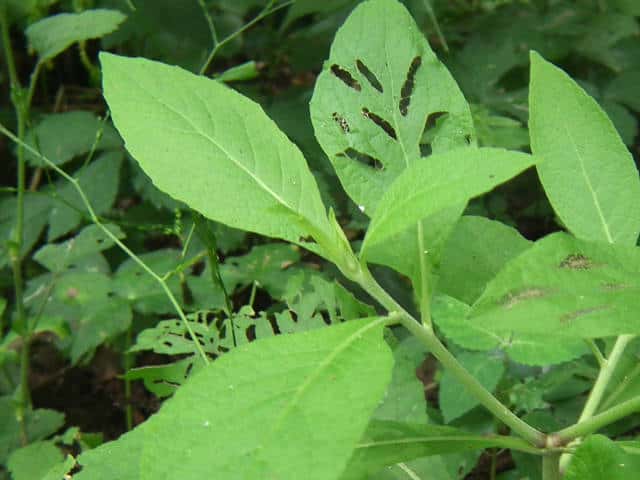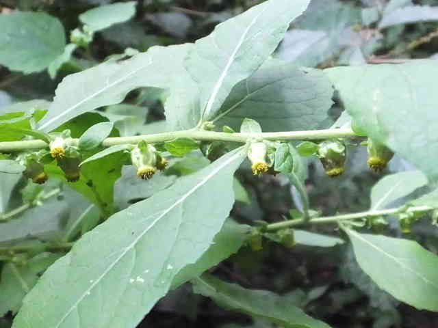 | 1〜越年草 日本全土の人家近くのやぶや林のふちなどに多い。茎は太く、高さ0.5〜1mで成長が止まり、上部から数本の長い横枝を放射状にのばす。根生葉と下部の葉は長さ25〜30cm、幅10〜15cmの広楕円形〜長楕円形で、薄くて両面とも短毛が生え、裏面には腺点がある、根生葉は花の頃は枯れる。上部の葉は長楕円形で、上のものほど小さい。上部の葉腋に黄色の頭花を下向きに1個ずつつける。頭花は直径約1cmで、ほとんど柄がない。総苞は鐘状球形。総苞片は3列に並び、外片は短い。そう果は臭気があり、長さ約3.5mmの円柱形。先は細くなり、粘液を出して動物などにくっついて運ばれる。花期は9〜10月。(野に咲く花) 学名は、Carpesium abrotanoides キク科ヤブタバコ属 似た花のガンクビソウは枝先に花がつく。 |