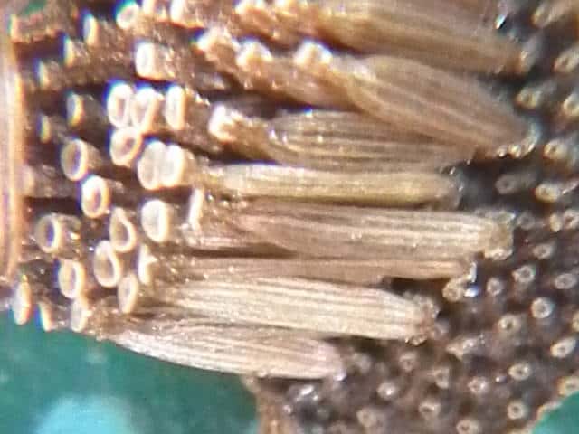 | ▼周辺の雌花。 | ▼頭花の縦断面。 | ▼雌花(上)と両性花(下)。 |