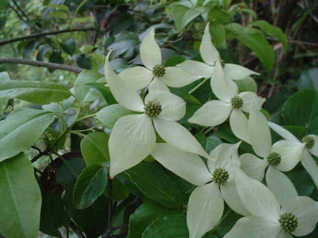 | 落葉高木 本州〜九州の山地の林内や草原に多い。高さ5〜15mになる。樹皮は暗赤褐色。老木では不規則にはがれ、まだら模様になる。枝は褐色または赤褐色を帯び、皮目が多い。葉は対生。枝先に集まってつく。葉身は長さ4〜12cm、幅3〜7cmの広楕円形または広卵状楕円形。先は鋭く尖り、基部は円形。縁は全縁で波打つ。裏面の脈腋には褐色の毛叢がある。葉柄は5〜10mm。葉の展開後に開花する。花びらのように見えるのは総苞片で、長さ3〜8cmの卵形または長楕円状卵形。総苞片の中心に、淡緑色の小さな花が20〜30個密集してつく。花弁と雄しべは4個、花柱は1個。果実は集合果。直径1〜1.5cmの球形で、核が1〜5個入っている。9〜10月に赤く熟す。核は直径3〜6mm。形も大きさもまちまち。花期は5〜7月。 冬芽の葉芽は長さ6mmほどの円錐形、暗褐色の伏毛が密生した2個の芽鱗に包まれる。花芽は長さ5〜7mmの扁球形で先はとがる。側芽は小さく、対生する。葉痕はV字形〜三日月形。維管束痕は1個。(樹に咲く花) 学名は、Cornus kousa subsp. kousa ミズキ科ミズキ属 |
