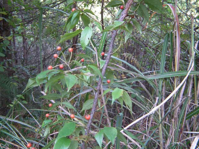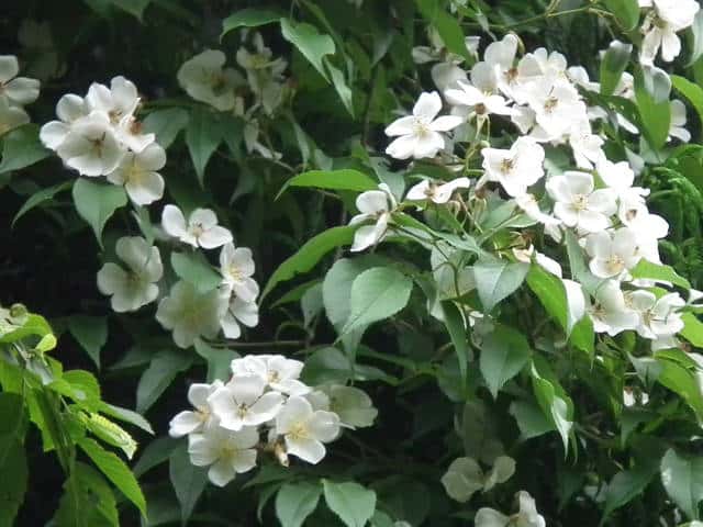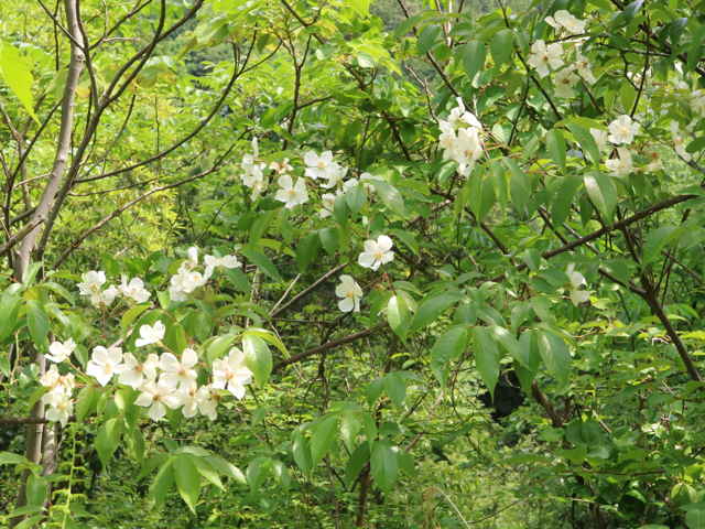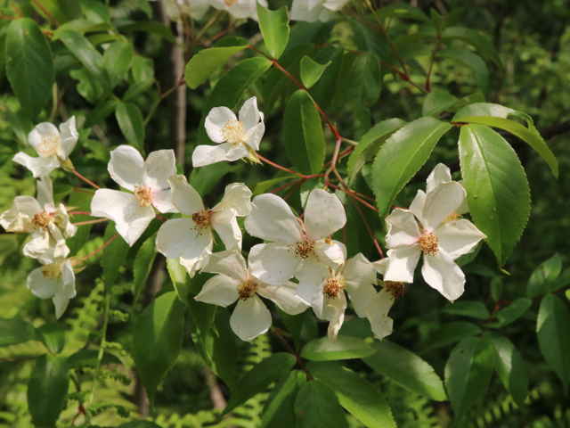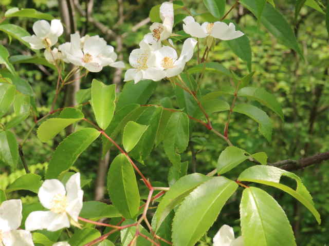 | 落葉低木 愛知県以西〜九州の山地にまれに生える。半つる性で、崖などをよじ登る。鈎形の強い刺が多い。葉は互生。長さ11〜15cmの奇数羽状複葉。ノイバラの仲間では最も大きい。小葉は2〜3対、長さ5〜10cmの長楕円形または楕円形で、先は鋭く尖り、縁には鋭い鋸歯がある。表面は深緑色で光沢があり、裏面はやや白い。頂小葉は側小葉よりやや大きい。托葉は幅が狭く、ほぼ全面が葉柄に合着し、縁には腺毛がまばらにある。枝先に白い花が10〜20個集まって咲く。花は直径4〜5cmと大きい。花弁は5個、花柱は有毛。花柄は長さ3〜5cmと長く、軟毛と短い腺がある。萼片には綿毛と腺がある。果実は偽果、直径8〜10mmの扁球形で、11月に赤く熟す。果柄は長さ3〜5cm。花期は5〜6月。(樹に咲く花) 学名は、Rosa sambucina バラ科バラ属 ノイバラの仲間 |