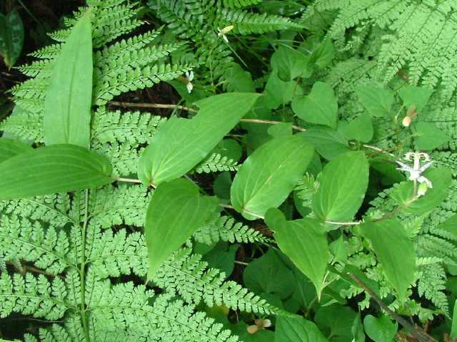 | 多年草 北海道南西部〜九州の山野に生える。茎は高さ30〜60cm。斜め下向きの毛がある。葉は卵状長楕円形または狭長楕円形で、まばらに毛があり、先は急にとがり、長さ8〜18cm。花は茎頂と葉腋に1〜2個つ。花柄に毛が多く、花は長さ約2cm、花被片は白色で紫色の斑点が少なく、下部には紫色の大きな斑点がある。上部は平開するがそり返らない。花糸と花柱とに紫色の斑点はない。花期は8〜10月。(日本の野生植物) 学名は、Tricyrtis affinis ユリ科ホトトギス属 |
