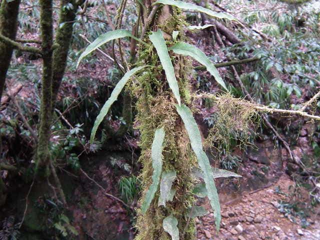| 常緑シダ植物 関東地方南部〜九州の山麓近くの林中の地上や岩上に見られる。葉は多形で、地上の根茎につく三角形の栄養葉から、岩上や樹幹に這い上がる根茎につく被針形の胞子葉まであらゆる段階が見られ、長いものは長さ20cm。ソーラスは円形で裏面の一面につく。胞子のつかない葉は三角形。 学名は、Leptochilus buergerianus ウラボシ科ヤノネシダ属 |