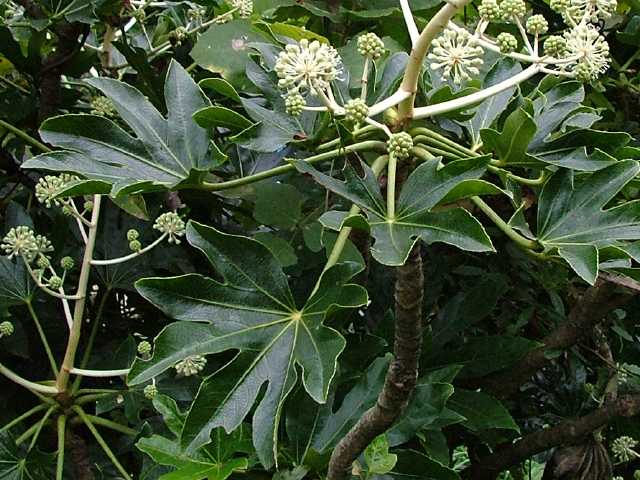 | 常緑低木 茨城県以南の太平洋側〜沖縄の海岸から丘陵の林内に自生する。暖地では人家付近や、社寺林など、いたるところで見られる。高さは1〜3mになる。樹皮は灰褐色。茎の上部には多数の葉痕があり、縦長の大きい皮目がある。若い枝は緑色、褐色の長い毛が生える。葉は互生。枝先に集まってつく。葉身は直径20〜40cmと大きく、掌状に深く7〜9裂する。基部は浅いハート形。裂片のふちには粗い鋸歯がある。質は厚くて光沢がある。展開したての葉や葉柄は褐色の毛に覆われる。のち無毛になるが、裏面には縮れた毛がすこし残る。葉柄は長さ30cm。雌雄同株。枝先に球形の散形花序を円錐状につけ、白い小さな花を多数つける。上部の花序には両性花、下部の花序には雄花がつく。花序の軸には褐色の毛が密生する。花弁は5個、卵形で長さ3〜4mm。雄しべは5個、葯は白色。花柱は5個。両性花は雄しべ先熟で、雌しべが成熟する前に雄しべが花粉を散らし、自家受粉を避けている。萼筒は長さ約3mmの鐘形。果実は液果。直径7〜10mmの扁球形。翌年の4〜5月に赤褐色から黒紫色に熟す。先端には花柱が残る。種子はややゆがんだ扁平な楕円形で長さ4〜5mm。花期は10〜12月。 冬芽の頂芽は卵形で先はとがる。葉痕は半月形またはV字形で、維管束痕は13〜15個。花芽は夏にでき、初冬に開花する。花序の軸のわきにできた葉芽が翌年の春にのびる。(樹に咲く花) 学名は、Fatsia japonica ウコギ科ヤツデ属 雄花と称しているのは、花序の中で枝分かれ回数の多い小花序で、最後に咲く花が該当し、この花は、はじめに咲く花と同じで、花弁と雄シベが成熟して花粉をつくりますが、雄性期が終わると雌シベの成熟なしに枯れてしまうのです。(tumu-tumu ツムラの掲示板) |