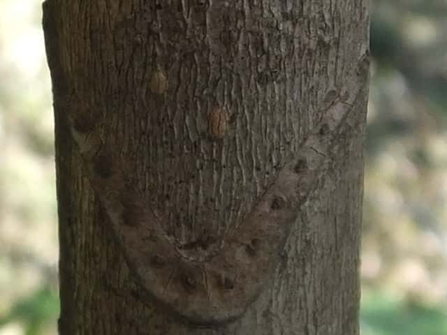 | ▼葉痕はV字形、維管束痕は10数個ある。 | ||
