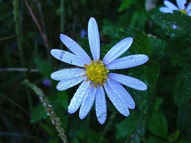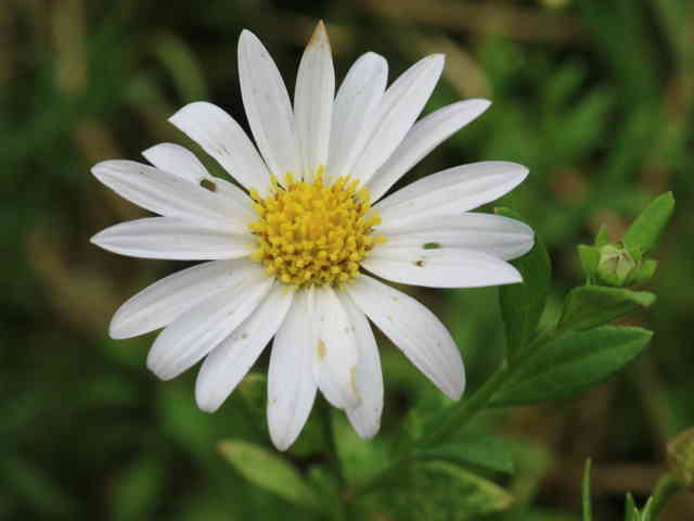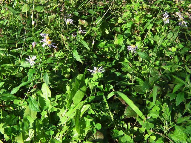 | 多年草 本州(中部地方以西)〜九州の山野の湿ったところにや道ばたにふつうに生える。高さ0.5〜1.2m。茎ははじめ赤みを帯び、上部でよく枝分かれする。茎の下部や中部の葉は長さ8〜10cm、幅約3cmの卵状長楕円形で、ふちには粗い鋸歯があり、3脈がやや目立つ。枝先に直径約3cmの帯青紫色の頭花を1個ずつつける。そう果は長さ約3mmの扁平な倒卵形で、冠毛は長さ約0.5mm。花期は7〜10月。(野に咲く花) 舌状花はふつう淡紫色だが、ときに白色で15〜20個前後。(日本の野菊) 学名は、Aster yomena キク科シオン属 よく似たノコンギクは冠毛が4〜6mmあり、全体に毛が多い。またオオユウガギクは冠毛が1mm。 |