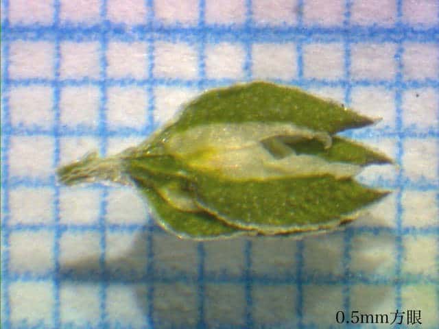 | ▼長さ約3mmの萼。開いた花はなく、閉鎖花なのか中に雌しべと雄しべがある。 | ▼中に果実を包んだ萼。 | |
