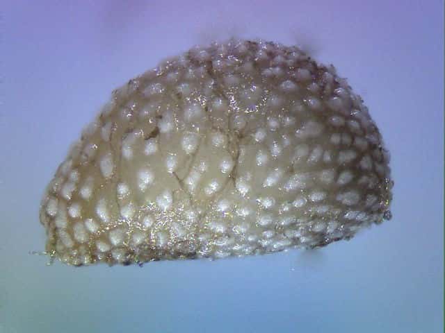 | ▼種子は不定形、長さ約0.5mm。 | ▼白色の突起が並んでいる。 | |