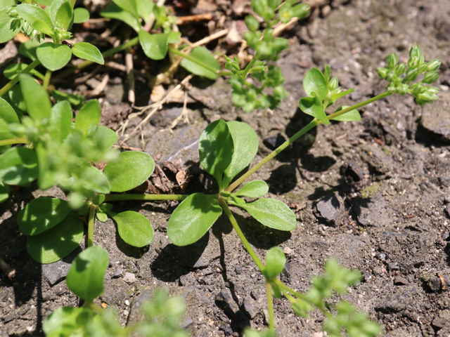 | 1年草 ヨーロッパからアフリカ、南アメリカなどに広く分布する。神戸市での帰化が1953年に報告され、現在では東海地方以西の道ばたや荒れ地に見られる。茎は低い波状の翼があり、基部からよく分岐して地を這うように広がり、高さ約15cmほどになる。葉は長さ1cmほどの楕円形から倒卵形で4枚が輪生する。葉の基部に膜質の托葉がある。茎の先に細かく分岐した花序をつけ、長さ2mmほどの5弁花の花を数個固めてつける。花期は夏。(日本帰化植物写真図鑑) 学名は、Polycarpon tetraphyllum ナデシコ科ヨツバハコベ属 松江市内でのヨツバハコベの確認地点(グーグルマップ) |