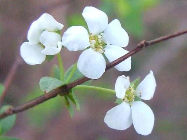 | 落葉低木 東北地方南部以南の主に太平洋側〜九州の川岸の岸壁の割れ目や岩礫地に生える。高さ1〜2mになり、枝先は垂れ下がる。樹皮は暗灰色。若い枝は褐色で縦にすじがある。はじめ白色の短い軟毛があるが、のちにほぼ無毛。葉は互生。葉身は長さ2〜4.5cmの狭披針形。先端は鋭くとがり、基部はくさび形。ふちには鋭い鋸歯がある。表面は無毛。裏面は脈上にわずかに軟毛がある。葉柄はほとんどない。前年枝に柄のない散形花序を多数つける。花序には直径約8mmの白い花が2〜7個ずつつく。花弁は5個、長さ2〜4mmの円形または広倒卵形。雄しべは20個あり、基部の内側に黄色の蜜腺がある。萼は無毛。萼片は卵状三角形。花柄は長さ6〜12mmで無毛。基部には小形の葉が数個ある。果実は袋果。5個ずつ集まってつく。長さ約3mm、5〜6月に熟す。花期は4月。 冬芽は長さ1〜2mmの卵形。芽鱗は紅紫色または緑色で、ふちには白色の微毛がある。(樹に咲く花) 学名は、Spiraea thunbergii バラ科シモツケ属 |