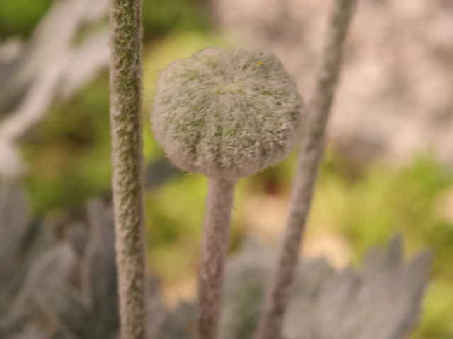 | ▼長い花柄の先に頭花が1個つく。 | ▼葉は羽状に深裂し、綿毛が密生する。 | ▼葉の裏面。 |