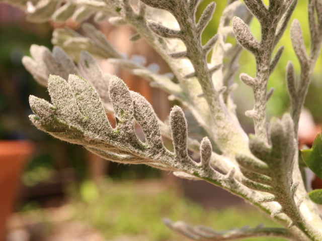 常緑低木 南アフリカ原産の園芸植物。高さ60〜100cm。葉や茎に柔らかい細毛が生え、全体が灰白色に見える。葉は長さ40~100mm、羽状に深く切れ込む。頭花は直径約5cm、明るい黄色、茎の頂部や枝先に疎に束生又は単生する。舌状花は12〜14個あり雌性、中心の筒状花は両性。総苞はカップ状で総苞片は1列。花柄は長さ7〜10cm。花期は11〜5月。 学名は、Euryops pectinatus キク科ユリオプス属 |