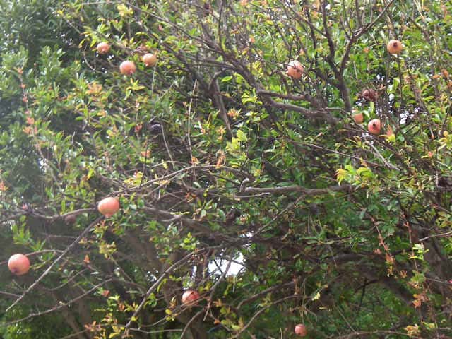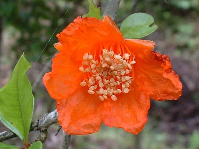 | 落葉小高木 西アジア原産。高さ5〜6mになる。樹皮は褐色で不規則にはがれる。本年枝は4稜がある。短枝の先は刺になる。葉は対生。葉身は長さ2〜5cm、幅1〜2cmの長楕円形で全縁、無毛。表面は光沢がある。枝先に直径約5cmの朱赤色の花をつける。花弁は6個、薄くてしわがある。萼は筒状で上部は6裂し、肉質で光沢がある。果実は直径5cmほどの球形、先端に萼片が宿存する。果皮は厚く、熟すと不規則に裂開し、多数の種子が顔をだす。種子の外皮は淡紅色で甘酸っぱい液を含み、食べられる。花期は6月。(樹に咲く花) 学名は、Punica granatum ミソハギ科ザクロ属 |