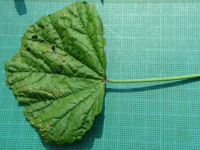 | ▼葉は浅く掌状に裂ける。 | ▼長い葉柄がある。 | |