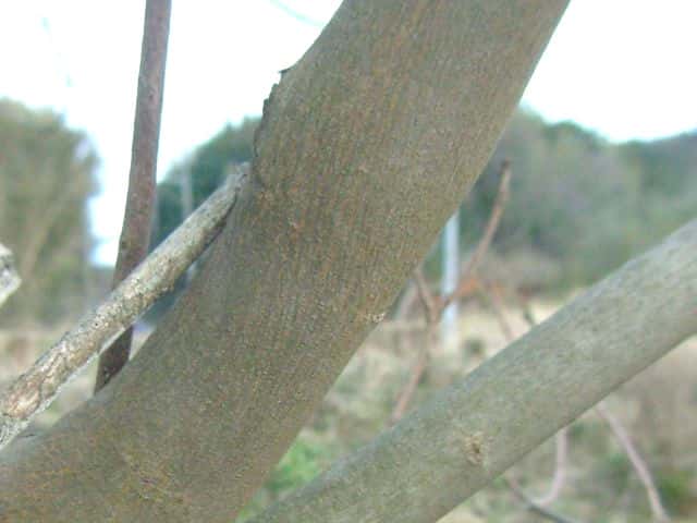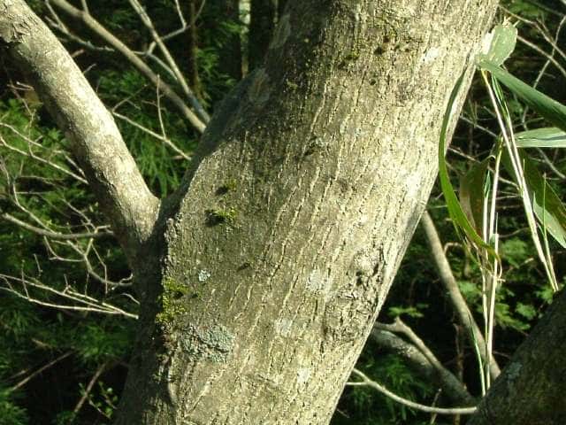 | イボタノキ | 樹皮は灰白色〜灰褐色。丸い皮目があり、幹にトゲが出ることが多い。 |