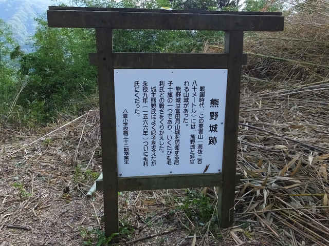 | 大きな岩があり、ここから急坂になる。 | 熊野城跡解説板 | 頂上からの八雲の山々 |