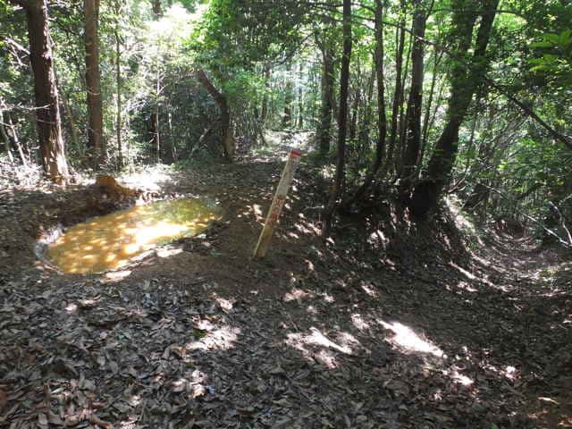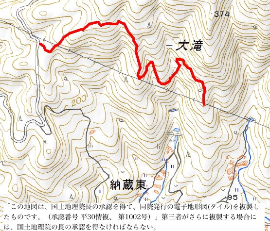 | 今日は東持田町の澄水山の中腹にある大滝を目指してみようと思いました。林道澄水山線の途中から鉄塔の管理道を行けば、大滝のある谷に行けるということで、2009年に一度は挑戦していますが、その時は途中で道がわからなくなり止めています。第二島根原子力幹線No.21〜23。 林道から急な傾斜の道を上がるとすぐに最初の鉄塔があり、その先を進むと落葉の降り積もった、深くえぐられた道が登っています。三叉路の道を直進すると最近人が通ったことがないような感じなので、引き返し、折り返すように続いている道を進みました。ここから一度下り、小さな谷を渡り更に進むと、2つ目の鉄塔があります。 鉄塔の手前を左へと斜面の細い道を下ると2つ目の谷があり、また斜面の細い道が続いています。3つ目の谷の奥が大滝なるようですが、まだ滝が見えるような感じはありません。谷を渡り左へと斜面を上がると、竹藪となって倒れた竹をくぐるように道が続いています。道は右へと次の鉄塔へ続いていますが、谷沿いとなるようにまっすぐ進んでみました。しかしすぐに枯れた竹に行く手を阻まれてしまいました。 大滝へのルート探しはあきらめて、道を進んでみることにしました。しばらく進むと3つ目の鉄塔へつきました。ここは南側が広く開けているので、宍道湖から中海方面まで眺望があっていい場所でした。 ここまでの大滝へのルートはこれでよかったのか、または別のルートがあるのか、また情報を集めてみます。 |