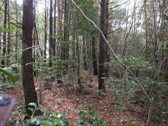 | 今日は玉湯町の上野山、室山へ上がり、時間があれば八雲町と東出雲町の境にある宝満山、また東出雲町の古城山に上がってみようと思います。 上野山(236.7m)は玉湯町が宍道町に接するところにありますが、ネットにも登山情報はありません。今回は、玉湯町から宍道町へ抜ける林道上野山線の道路脇から作業道へ入り、山を回ったところから入ってみようと思います。 道路を奥に入ると、急傾斜だった山が道路脇から入れるようになるので、上がってみることにしました。草やシダはなく、木や茨もまばらなので、なんとか尾根まで上がることができました。頂上はもう一つ先のピークなので、一旦鞍部へ下りてから斜面を上ります。 頂上部分はブッシュも多く見通しがきかないので、三角点を探してもなかなか見つけられませんでした。諦めようかと茂みを回りこんでみると、白い三等三角点(上野山 236.70m)の標示杭が見えました。頂上は木々に囲まれ、全く眺望はありません。 下りは同じルートを下がろうとしたものの、上がったルートが見つからず手前から斜面を下ってしまい、急斜面の場所に出てしまいました。少し引き返し、緩斜面の方へ下りましたが、道路から高い場所で下りることができず、最初に山へ入った場所まで行くことになりました。 室山(159.3m)は、玉湯町林にありますが、この山もネットに登山情報はありません。高速の側道から作業道が山へ向かっているので、ここから登れるのではないかと、上がってみました。調整池の上には展望台があり、公園になっているようです。 作業道を奥に進み、上に上がるように右へと分岐し、斜面を上ったところで、左へと行き、2度右へと分岐し上がっていきました。作業道が終点となり、斜面を上へと上がると、目の前に作業道がありました。先ほどの分岐が間違っていたようなので、確認のために分岐まで引き返し、左へと進んでみました。この先で作業道は終点となり、急な斜面を木々に掴まりながら上がっていくと、平坦な場所にたどりつきます。 頂上部分は若干開けた場所になっており、三角点(林 159.34m)はすぐに見つかりました。三角点からは、反対方向へ不明瞭ながら踏み跡が続いているようなので、向かってみることにしました。 最初は踏み跡が草の中で不安がありましたが、植林地に出ると、植林地の脇に踏み跡らしきものが続いていました。急斜面を下りると道路脇へ下りてきました。山の西側は植林が進んでいるようです。踏み跡脇に古いテープが残っていたので、こちらが登山道になっていたのでしょう。 宝満山(147m、126.3m)は八雲町と東出雲町との境にありますが、2つの峰があり、地理院地図は2つの峰の間に宝満山の表記があり、他の地図では三角点のある方に宝満山の表記があります。2つの峰を結ぶように鉄塔があるので、鉄塔巡視路を歩けば、縦走ができると思われます。 八雲町東岩坂川原地区の河原神社から500mほど道路を奥へ入ったところの作業小屋のある田んぼの脇から山へ入ります。細い道は笹が多いですが、少し入ると鉄塔巡視路に合流します。 巡視路は急な斜面を上がると、尾根にたどりつきます。山の北側は植林のために伐採されているので、中海方面の眺望が開けています。頂上付近は木々もまばらで開けている感じです。頂上から少し進んだ所に鉄塔があり、その先に巡視路が続いています。 巡視路は下り、最後は急斜面となって、一旦鞍部におります。鞍部の平場を進むと、その先に鉄塔の案内標識が見えます。ここからまた急斜面をつづら折れに上がっていくと、鉄塔があります。頂上はこの鉄塔を通り過ぎ一段高くなっている場所で、ブッシュの中に三角点(水越 126.27m)がありました。三角点を示す白い標示杭は見あたりませんでした。頂上からの眺望はありません。 三角点の先に巡視路は続いており、大きな岩のあるところから下がって行くと、2本の鉄塔のある場所にでてきます。鉄塔敷地は急斜面になっており、その下の方に巡視路が続いています。巡視路は樹林内を進み、やがて明るい林の先に道路が見えてきます。 古城山(57.3m)は東出雲町竹花にある小さな山ですが、県道大東東出雲線のバイパスにより分断されています。ネットには登山についての情報はありません。どんな山なのか様子を見ようと、近くの西側の道を通ってみると、山へと入っていく道がありました。どこまで行けるのか入ってみました。 山道を進むと、植林された林内の谷へと道は続き、両側は急斜面になっています。谷の奥へ進むと、シダが生えた短い斜面があり、尾根に上がれそうです。尾根に上がると、木々はまばらで、踏み跡がありそうな感じで、頂上へ向かって楽に進めました。頂上には白い標示杭があり、三等三角点(古城山 57.28m)が確認できました。 三角点の先へ向かって尾根筋に踏み跡があるような感じなので、進んでみましたが、途中でシダも多く藪のような状態になり、時間もないので引き返すことにしました