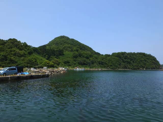 | 法田の港へ下る。正面に釣鉾山が見える。 | 法田港から見た釣鉾山。 | 12:59 港を回った先の岩の脇から入る。 |