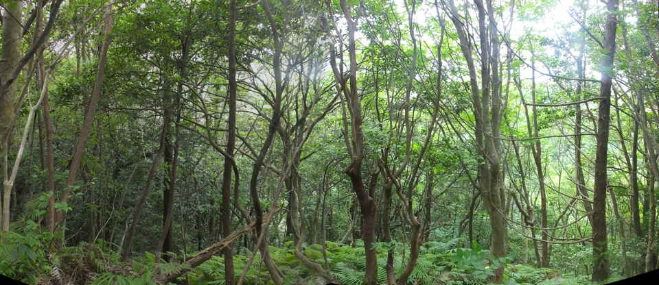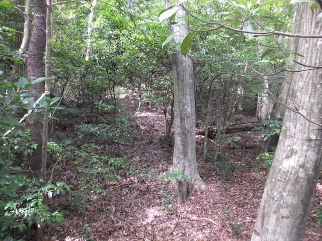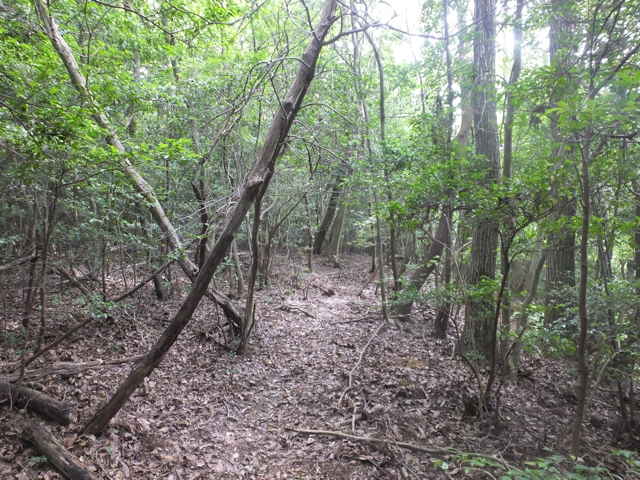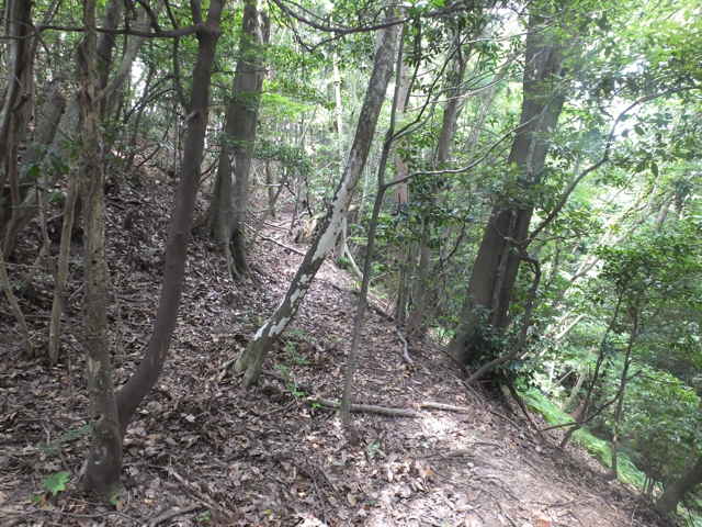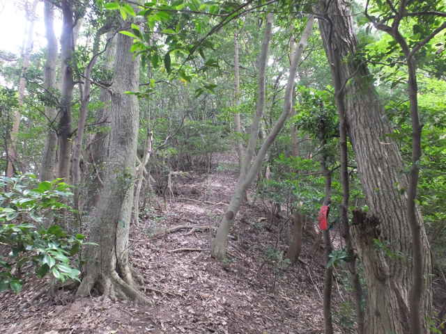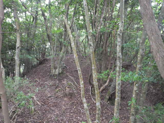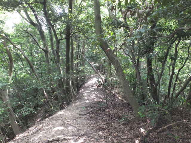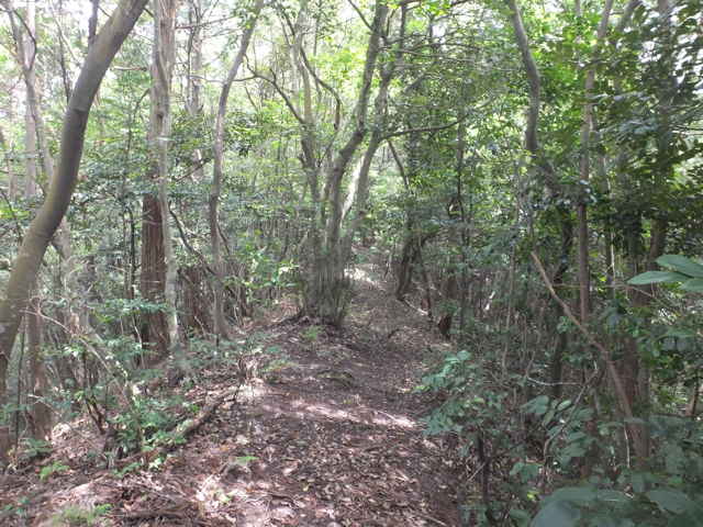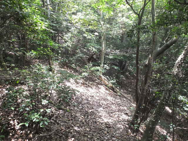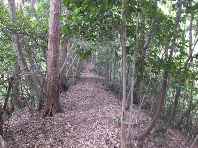 | 今日は、東出雲町上意東の福良城跡から尾根を上がってみようと思います。京羅木山の神庭コースから分岐して、尾根沿いに下ったところに広い尾根道があり、この尾根が福良城跡の尾根に繋がっているので、道があるのか確かめることが目的です。 上意東高庭から畑地区に向かって1kmほど入ると、左側に福良城跡入口の案内板がある。ここから山へ向かって作業道がある。作業道を入ると案内標識はなく、植林地内へ入った所で、左へ分岐するような道もあるが直進すると作業小屋があり、作業道は行き止まりとなってしまう。少し引き返し先ほどの分岐を入ると、4段ほどの木の階段があり、左へ上がっていくと尾根道へ到着する。 まず尾根道を左へと進むと、途中に堀切があったりして城跡の雰囲気がする。13分ほどで頂上へ着くが、木々に囲まれ眺望は全くない。ただ木々が落葉した冬期には木の間越しに見えるかもしれない。 上がってきた道を引き返し、尾根に上がった場所から反対側に延びている尾根道を進む。尾根から道がはずれ斜面を少し行くと、左右に続く広い尾根道に出会う。進む方向は右なのだが、左の尾根はどこへ向かっているのだろう。 尾根道は荒れているところもあるが概ね歩きやすい道が続いている。標高236mのピークに上がると反対側の斜面は植林地となっており、ここから左へ植林地との境の尾根を進む。1時間半ほど尾根道を歩いて行くと、見覚えのあるテープが結んである場所に出てきた。ここは7月6日に通った神庭コースから分岐して尾根沿いに下がったところの道だった。 4分ほど歩いて高丸地区の谷へ下りるだろうと思われる斜面を進んでみるが、急斜面に枯竹が折り重なって倒れていて歩けそうにもないので、ここは引き返しました。三角点「岩舟」のあるピークを越えて進むと右へ分岐があり、この先に広い尾根道が安来市岩舟町側へ続いていることを5月31日に確認しています。今回どこまで続いているのか歩いてみましたが、10分ほど進むと道が不明となってしまったので、時間もないので引き返しました。引き返す途中で南に分岐する踏み跡のようなものがあったので、また機会があれば歩いてみようと思います。 分岐点まで引き返し、高丸地区の農道まで尾根を歩こうとしましたが、ピークから西へ向かう尾根でまた道を間違えてしまいました。見通しの悪い藪の中で、いつも間違えてしっかりテープを結べていないので、ついつい歩きやすい方へ向かっているのが原因なのでしょう。次回にゆっくりルートを確認しようと思います。 |