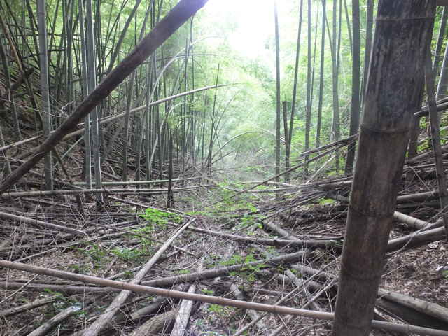 14:10 谷は急斜面で枯竹が折り重なっていて、引き返す。 |