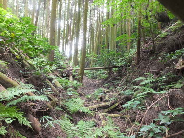 | 14:35 右側の植林地内の谷へ下りる。 |