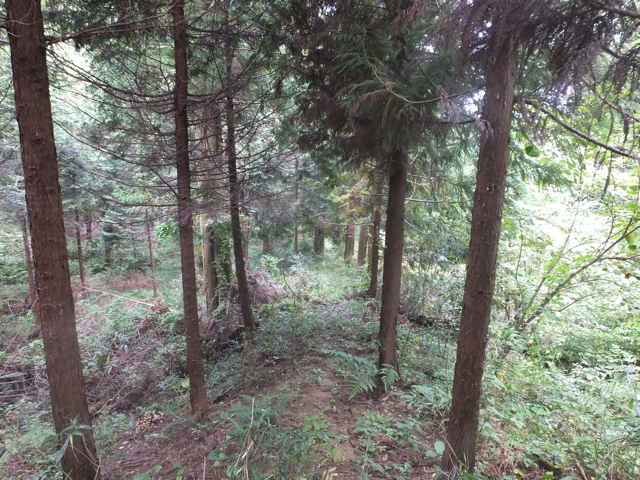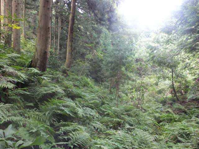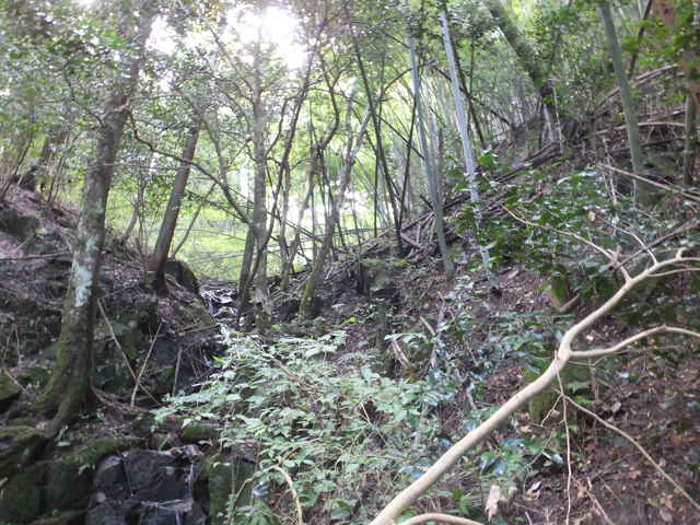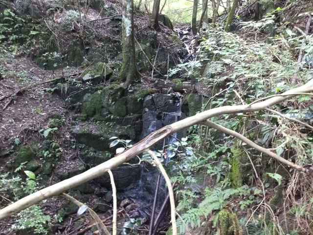 | 今日は上意東畑水源から奥へ続く作業道を入り、京羅木山の荒田コースへ合流できるか、上がってみることにしました。また以前に通ったときに荒田コースの途中から踏み跡が脇へ続いているような所があったので確認してみようと思いました。 上意東畑地区の市道を上がって行くと、左へと作業道があります。川沿いの作業道を上がって行くと、畑水源跡があり、更に作業道を上がって行くと、草が多くなり作業道は終わったかと思われますが、川が左へと流れが変わり、作業道はまだ続いています。 先が少し開けた場所で、作業道は終わっていました。ここから谷が2つに分かれており、右の谷へ入ってみました。川沿いの斜面を上がって行くと、すぐに目の前に滝があります。滝の上部へ上がらないといけないようですが、川沿いは急斜面で足場が悪く、掴まるような木もないので、少し右へ回り込んでなんとか上がりました。先は竹藪になっているようだし、対岸を見ると斜面に道があるようにも見えました。(10月31日に再度確認すると、滝の手前で左の斜面に上がるのが正解のようです。) 川へ降りて対岸へ渡ると、木々の間に踏み跡が見えました。斜面には石垣を積んだ水田跡のようなものがいくつかありました。 植林地の間を踏み跡を頼りに上がって行くと、溜池の跡と思われる湿地があり、その間に踏み跡のような道があり、その先には広い道のようなものが続いていました。荒田コースへは、直進して斜面を上る方向だと思われましたが、広い道を左へ進んでみました。しばらく行くと広い道は終わり、踏み跡もありませんでしたが、右の斜面を尾根に向かって上がりました。尾根に上がった場所は、三郡山から少し北へ下りた場所でした。 三郡山から荒田コースへ入り、10分ほど進むと右側に自然石の石碑があります。碑文は「佐々布久神社財産也 一□□三町五反2畝□ 杉桧一万四千本植付 大正三年三月 氏子」と読めます(佐々布久神社は広瀬町石原にある)。この先に右に向かって踏み跡が下りているようなので、入ってみましたが、踏み跡はすぐに無くなり、竹藪の急斜面になっているので、諦めて引き返しました。 さらに荒田コースを進んで、勝山コースとの出会いの手前の左にすぐ三角点があるようなので探してみました。1番高そうな所を探してもなかなか見つからないので、だいぶうろうろしましたが、藪の中に白い標示杭が見えました。四等三角点(神庭256.1m)でした。 この三角点の丘の手前に植林地の間を下がって行くような、踏み跡があります。踏み跡を下がって行くと、作業小屋があり、また少し先には半壊した廃屋がありました。近くにはゴミがたくさん捨てられており、こんな所で生活していたのでしょうか。この先で踏み跡が分かれていて、右へ進んでみましたが、しばらくすると踏み跡がなくなり藪になってしまったので、引き返して先ほどの分岐を直進してみました。直進の道も谷へ下がって行くと、笹に覆われ藪をかき分け谷まで下がりましたが、踏み跡はなくなり、こちらも藪になってしまい諦めて引き返しました。 |