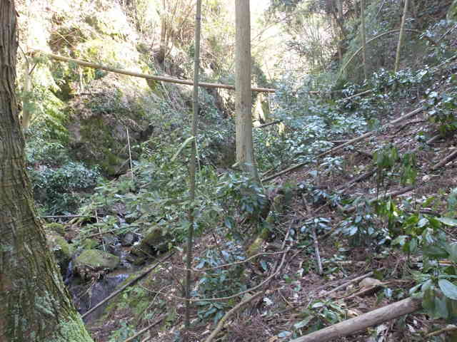 | 今日は12月12日に同じ谷を上がり、左の尾根から山伏塚への入口に上がったので、今回は途中から右の尾根へ上がり、山伏塚を目指すことにしました。 以前と同じように山口谷コースへ向かう途中の橋の手前から谷へ入り、川沿いに上がっていきます。10分ほど上がると、川の両岸が岩山となり、その間を川が流れるようになるので、川へ降りて岸を進みます。岩を抜けて10分ほどで大きな滝があり、斜面を滝の上部へ上がります。滝を越えてから10分ほど行くと、谷が2つに分かれるところがあり(先日は右の谷へ上がった)、ここから先へ行くと、両側の斜面も急になるので、この手前から尾根へ向かって斜面を上がります。 斜面は人が通った様子もなく、藪となっていますが、通れない状況でもないので、枝を切り払いながら上がります。15分ほど藪を上がると、藪は終わりますが急斜面が続きます。しだいに岩が多くなって、ピークに着くと山伏塚で、越えたところは広場になっています。 広場を南に向かうと京羅木山の縦走路へ出会うはずですが、南側には急斜面があり、正面からは上がれそうにはありません。右へ回ってなんとか斜面を上がると、稜線の反対側には溜池がありました。 ここから尾根を上がって行くと、腰の高さまである笹が多くなり、歩きにくいのですが、10分ほどでピークに上がると笹も終わり、さらに尾根を上がって行くと縦走路に出会いました。 帰りに荒田コースの途中から延びる尾根を下がってみましたが、途中から踏み跡もわからなくなり、またルートも東へ逸れて斜面を下ってしまい、時間もないので引返しました。 |