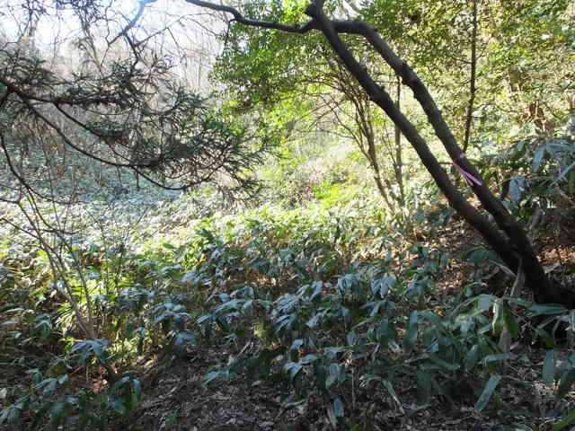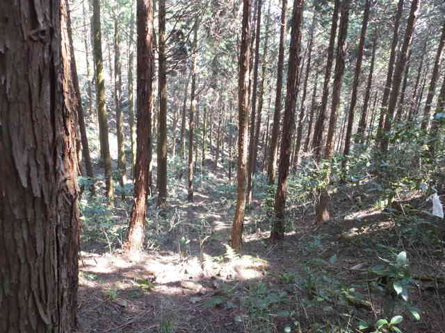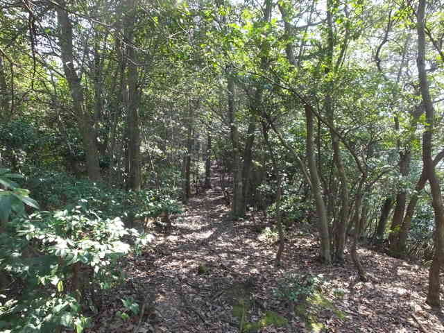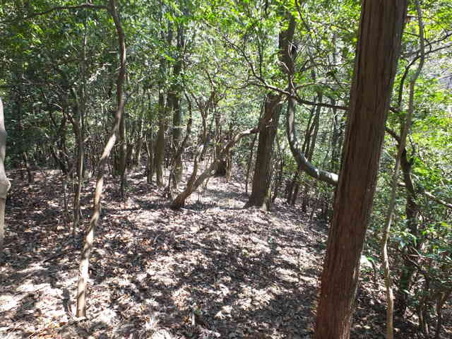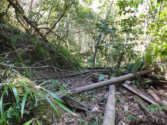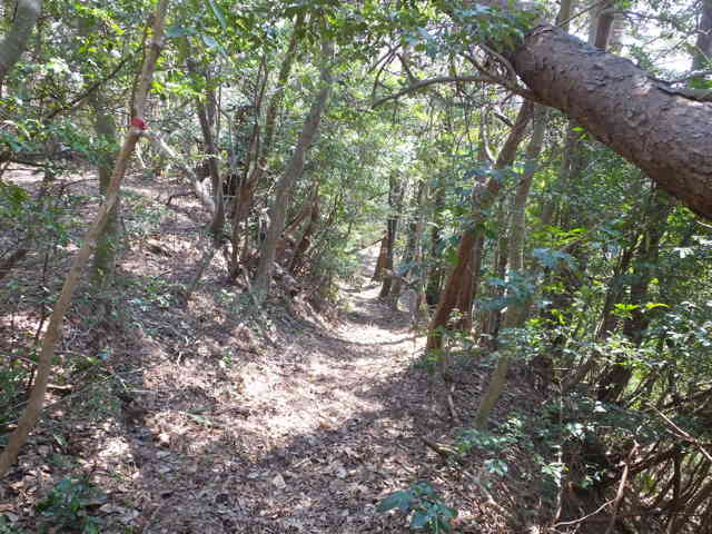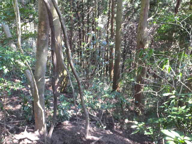 | 今日は先日、勝山の麓で地元の人に勝山城址への道があると聞いたので、逆に勝山城址から下ってみることにしました。また、地理院の京羅木山の古い写真を見ると、荒田コースの途中に水田や家が写っているので、様子を見ることにしました。 荒田コースを神庭コースとの交差点から10分ほど下がると、右脇に石碑があり、ここから左へ下ります。下っていくと右に溜池があり、その先の左に竹に覆われた平場があり、この上あたりが人家が写っていた場所になります。竹林の中を上がると、湿地になった広い平場があり、少し進むと木々に囲まれた中に人家の跡と思われる木材やゴミがありました。 広瀬町石原からのハイキングコースとの分岐を過ぎると、すぐに勝山城址へのコースが分岐しています。歩きやすい尾根道を進むと最初のピークに着き、勝山や広瀬の月山が展望できます。右手前方に青いテープがあり、そこから踏み跡が続いています。一度尾根の鞍部に下り、再度ピークへ上がると、目の前に三重の堀切があり、案内標識が左を指しています。ピークを左へ周ると何筋もの竪堀が斜面に伸びています。一段上がると、郭跡と思われる平場があり、更に尾根に道が続いています。5分ほど尾根を進むと、広い平場があり、主郭跡と思われ、広瀬の街が見下ろせます。 ここから下れる道があるはずなのですが、それらしきものが見あたりません。平場南側の左の隅に青いテープが結んであり、なんとなく下りられそうな雰囲気もありますが、最近人が通った様子はありません。しかし、先日話しを聞いた道は、方角的には南に下るしかないので、向かってみることにしました。 急斜面を踏み跡がないかと、探しながら下りてみましたが、それらしきものは全くありませんでした。藪の中は小木は少なく、枝を切り払いながら進めますが、足下に注意をしないと滑って転びそうな急斜面です。30分ほど下がると篠竹が多くなり、左へ周ると、前方に植林地が見えました。植林地を10分ほど下がると、前方が明るくなり谷に堰堤が見え、谷に沿って下がって行くと石原の集落につきました。 帰りは半場から山を越えようと、半場集落へ長い谷に続く舗装道路を30分ほど歩き、集落の突き当りから作業道が山へ続いています。半場へは2016年1月6日に下っており、その時には枯竹が折り重なった中を迷いながら下りているので、再度確認することにしました。作業道を上がって行くと、密生した竹林の手前で作業道は終わっていました。竹林の間の道らしき隙間を抜けると、少し開けた場所になり湿地になっています。ここを直進し、小さな崖を上がると、枯竹が多くなりますが、以前はもっと枯竹が多かったような気がします。竹の中の谷を上がって行くと、3月18日に岩坪へ向かった尾根に上がってきました。右へ笹原の谷を上がり、谷を左へ回って、右へ上がると笹原を抜けて斜面を上がります。再度笹原を抜けて、5分ほどで京羅木山への縦走路に上がるので、尾根を越えて峠の茶屋跡から山口谷コースを下りました。 |
