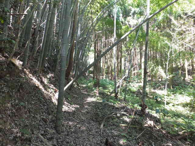 11:26 尾根筋は竹藪の急斜面で右へ回る |