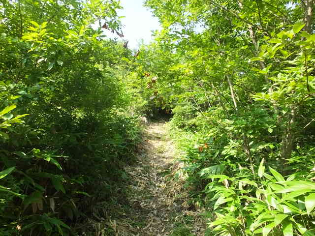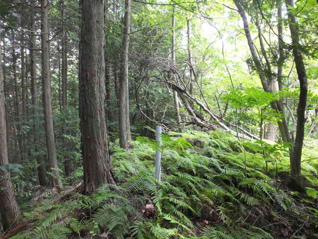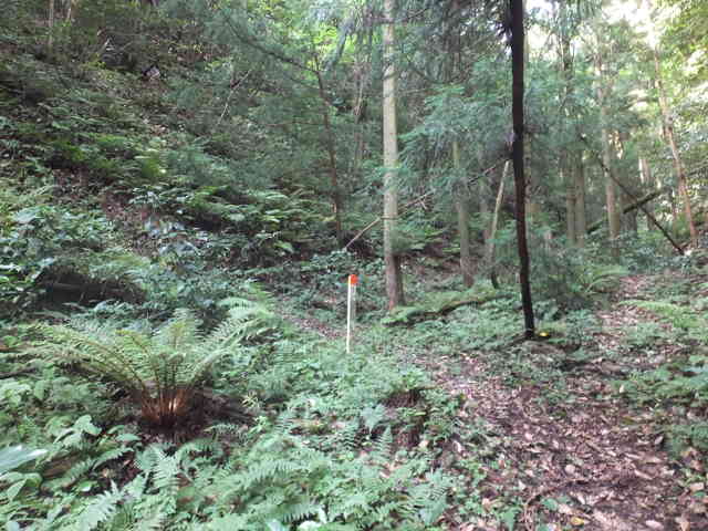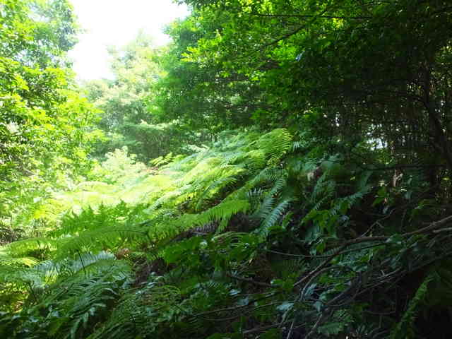 | 12:20 尾根はシダが生え、右側の斜面を行く。 |