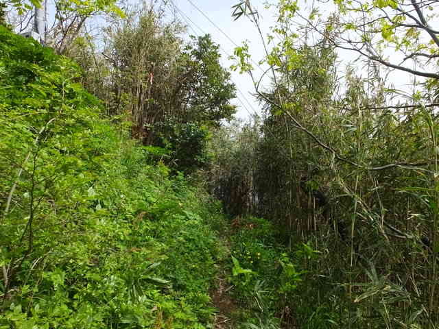 13:33 小径をはさんで電柱の反対側の藪際に三角点がある。 |