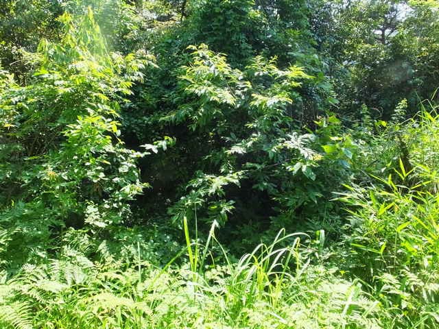 電柱の手前の茂みの中に山道がある。 | 14:57 入りがけは木々や草が多い。 |