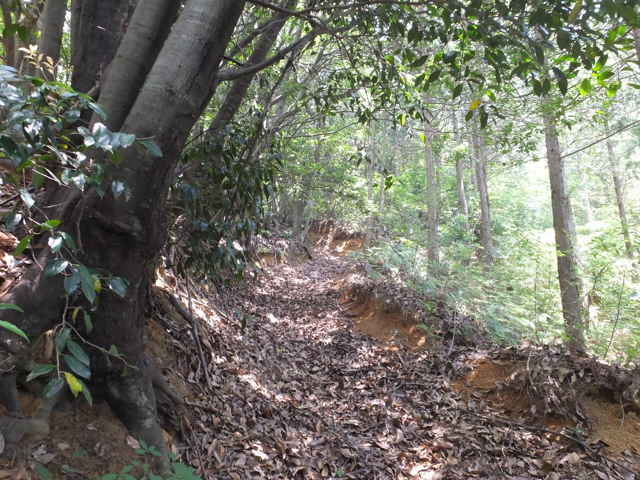 ナタに加え鋸も持参しました。 林道澄水山線から鉄塔巡視路を入って、1番目の鉄塔、2番目の鉄塔を過ぎると、谷の斜面が崩れて倒木があったり、トラバースする踏み跡が細く足場が悪かったり、注意が必要となってくる。2つの谷の橋を渡り、さらに斜面を回り込むと、大滝のある金井谷につきます。谷の中に大きな岩があり、その左横に隙間があるようで、先に進んでみますが、こちらも竹が倒れ込んでいて、通れそうにありませんでした。元へ引き返し。谷の右側の一段高い場所へ上がり、ここから竹を切って進もうと思いました。ここは2月27日に竹を切りながら少しだけ進んだことのある場所です。竹を切りながら谷の流れの方に進み、流れを渡って、歩きやすい場所を探しながら、さらに竹を切りながら上がっても、目の前には倒れ込んだ竹しか見えません。ここらへんで諦めようかとも思いましたが、ここまで来たのだからと、時間も余裕があるのでもう少し進んでみることにしました。何とか竹藪を過ぎると、小さな滝がありました。この滝からは、右の斜面から上部へ回り込んで行くと、谷の奥に滝らしいものがありました。 しかし、ネットにある大滝の写真とは姿が違うので、場所が違うようです。谷の奥の少し手前にあった小さな滝の位置が、地理院地形図にある大滝の位置とほぼあっているのも不思議な気がします。(他のサイトでは、この滝を大滝としているものがあります。)この谷の上部では川が分岐しているような状況はなかったので、まだこの先を上がって確かめる必要がありそうです。まったく幻の大滝です。 地形図の記載ポイントを鉄塔巡視路からたどった場合、サイト「松江北山 大滝」には、「ただし「大きい滝」と思うと肩透かしをくう。」とあり、またサイト「松江北山 幻の滝」には、「あっけなく見つけた幻の滝は、超ショボい小便滝だった。」とある。しかし、金井谷の堰堤から上がった場合には、サイト「金井谷の大滝」には「高さは30mぐらいありそうですが、水量は少ないみたいです。」とあり、サイト「金井谷の大滝(島根県松江市)」には「総落差40mと言われる大滝を眺めることが出来る。」とある。滝を見た感想がそれぞれ違うので、同じ滝とは思えず、地形図の大滝とは違う位置に大きな滝があるのかもしれません。 (7月17日、ついに金井谷川の堰堤から川を遡って、金井谷の大滝を発見しました。やはり地形図とは位置が違ったところにありました。) 時間があったので、先日(6月17日)持田別れのルートから分岐して尾根を下がったコースは、坂本へ出てしまったので、金井谷の方へのルートがないのか再度歩いてみることにしました。滝から引き返し、分岐から尾根を上がっていきます。小さな平場へ上がったところから、南へ尾根を下る分岐があります。20分ほど尾根を下がると、踏み跡が斜面を下がるルートと左へ尾根を進むルートの分岐があります。今回も尾根を進み、その先の藪になった急斜面を、先日下りた尾根の西側になるように下りました。斜面を少し下がると、踏み跡に出会いました。これは大滝の谷から続く鉄塔の巡視路だと思います。2015年7月15日に一度だけ、この巡視路を歩いて尾根の先の鉄塔まで行っています。この尾根に入る分岐から、斜面を下がる踏み跡をたどると、たぶんこの巡視路に出会うことになると思われます。(巡視路はもう少し下にあり、この踏み跡は尾根との分岐から続く古い道と思われ、少し下がると巡視路に繋がります。) 巡視路を歩くとすぐに鉄塔No.23につき、斜面の左下に巡視路が続いていました。この巡視路を下がるとまた先日と同じ坂本に出るような気がして、斜面を下りる巡視路を避け、尾根を下がることにしました。尾根の小高いところに上がると、石灯籠があり、その側に「大山講再興記念碑」、「昭和三十五年四月廿四日建之」と記された石碑が建っていました。尾根の先から急斜面を下がっていくと、また巡視路に出会いました。多分同じ巡視路と思われます。その先巡視路は左へ折れて下がっていますが、踏み跡がありそうなので、直進しました。尾根の先は密生する竹藪となりましたが、何とかすり抜けながら下りました。その先は今度は背の高い笹が生えるようになり、また倒れた枯竹も見えてきました。密生する笹の向こうに明るい草地が見えるので、笹をかき分けて藪を抜け出しました。出たところは、ススキの原野となっており、以前は田んぼだったところのようですが、幸いに湿地はなかったので、ススキをかき分けて道路まで出ることができました。なんとか昔のルートを見つけたいと思いますが、まだまだかなわないようです。しかし、だいぶ様子がわかってきたので、また歩いてみようと思います。 |